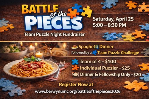 Battle of the Pieces is a fun-filled evening of food, fellowship, and friendly competition at Berwyn United Methodist Church. Guests can enjoy a spaghetti dinner before teaming up for a lively puzzle challenge. Whether you come with a full team, sign up as an individual puzzler, or simply join us for dinner and fellowship, this event is a great way to connect with others while supporting the ministry of the church.